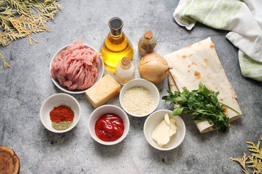 Подготовьте все необходимые ингредиенты для приготовления бейти-шашлыка. Петрушку сполосните и отряхните от воды, репчатый лук почистите и сполосните.