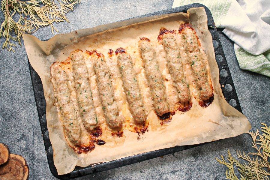 Противень застелите пергаментом и смажьте растительным маслом. Сформируйте кебабы и выложите на небольшом расстоянии на пергамент. Поставьте противень в горячую духовку и запекайте кебабы в течение 15-20 минут в зависимости от толщины.