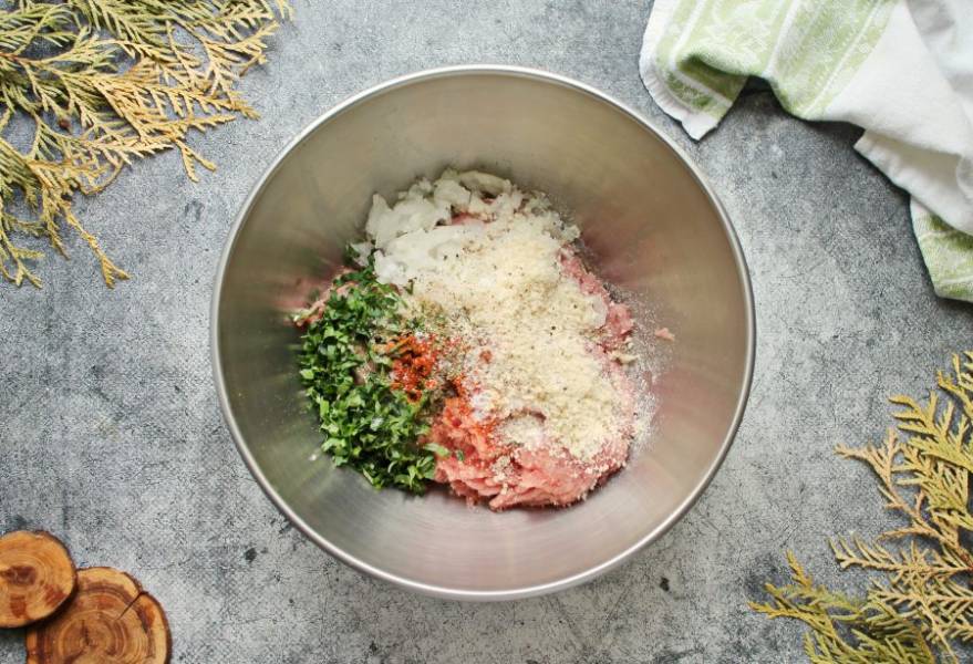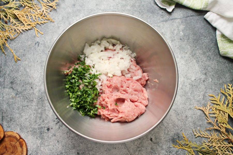 Мясной фарш выложите в миску, добавьте мелко нарезанный репчатый лук и рубленую петрушку.
