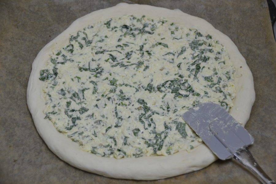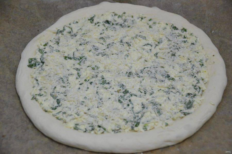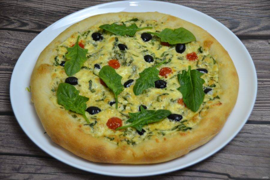 На уже готовую пиццу выложите листочки шпината, которые оставили ранее.