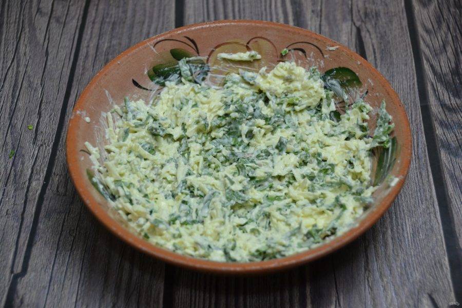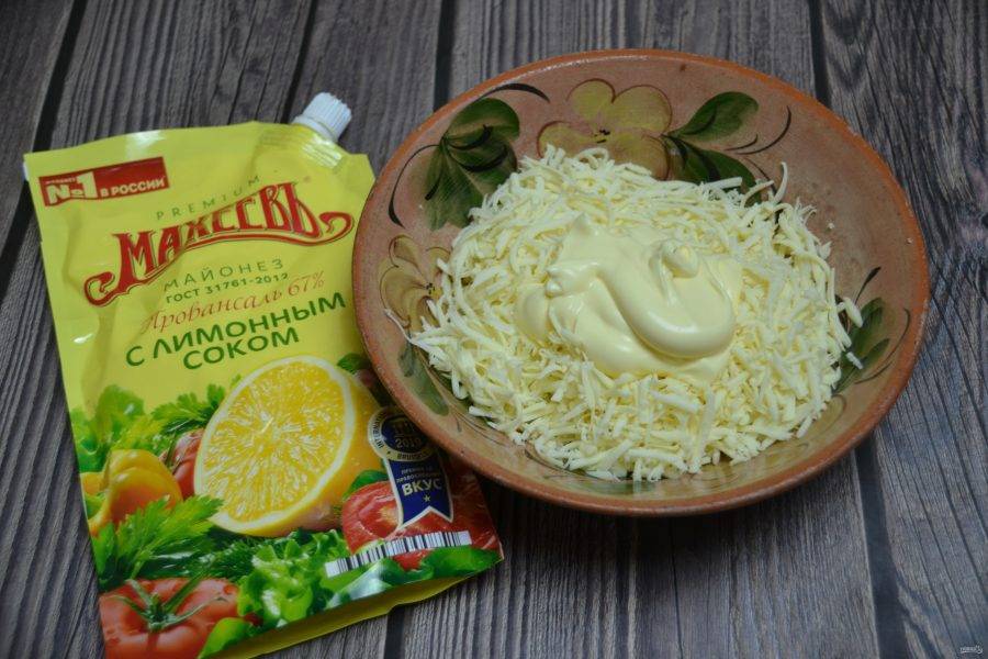 Пока тесто на расстойке, подготовьте соус, для этого натрите на терке моцареллу, добавьте 3 столовые ложки майонеза "Провансаль с лимонным соком" "Махеевъ".