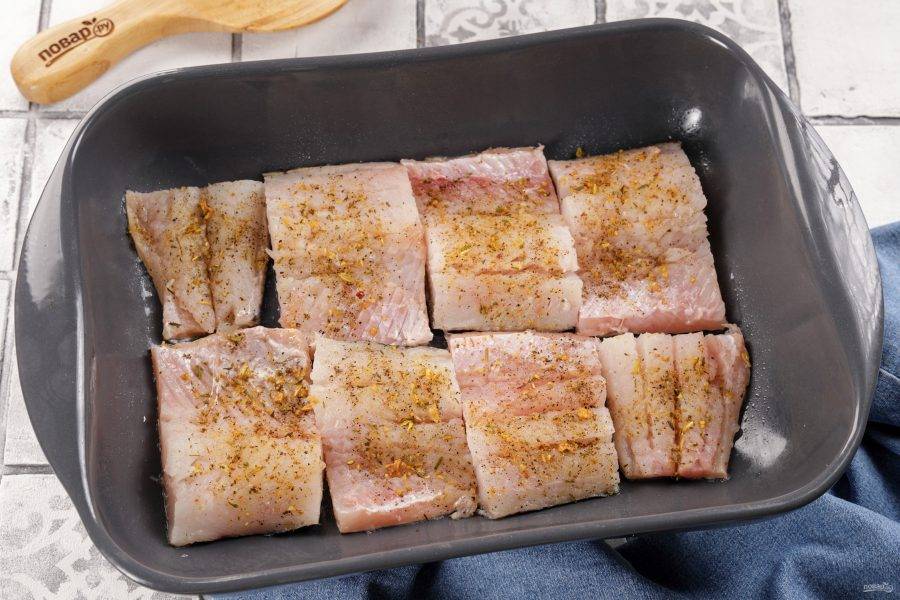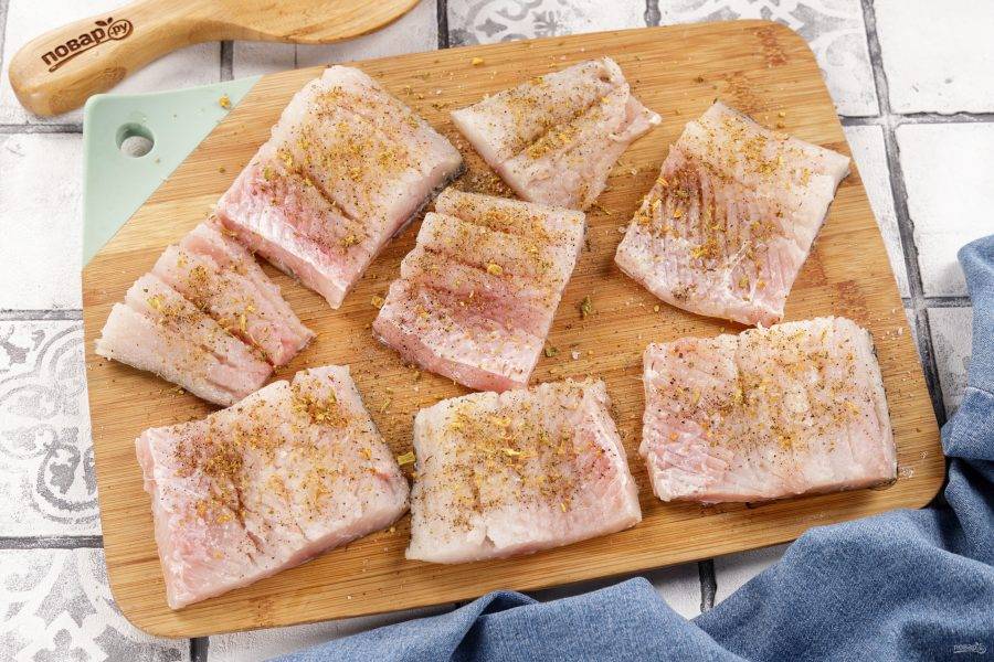 Посолите и поперчите. Можно использовать готовую смесь специй для рыбы. Оставьте мариноваться.