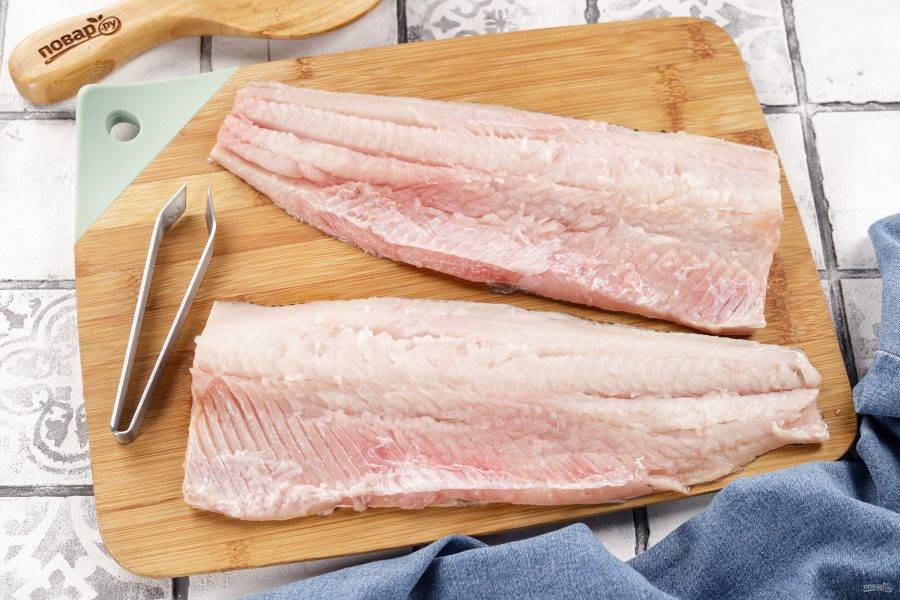 Филе промойте и хорошо обсушите. Если у вас целая рыба, то разделайте её самостоятельно. Обязательно пинцетом удалите всё крупные косточки, кожу можно оставить.