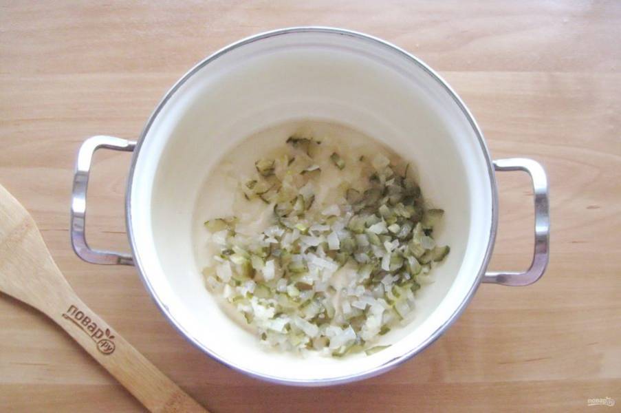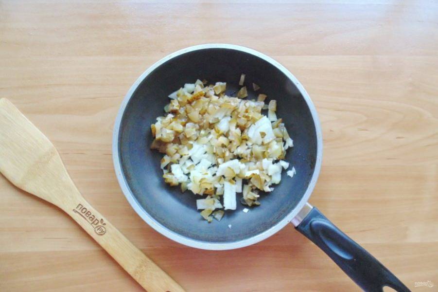 Соленый или маринованный огурец мелко нарежьте и выложите в сковороду. Репчатый лук очистите, помойте и мелко нарежьте. Добавьте к огурцу.