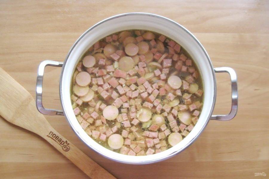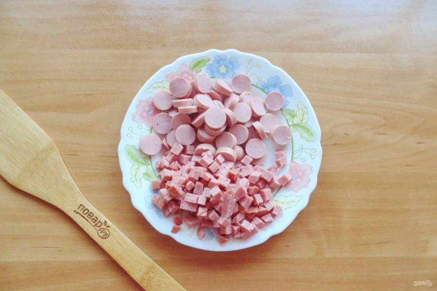 Пока овощи тушатся, займитесь колбасой. Мелко нарежьте сосиски и полукопченую колбасу.