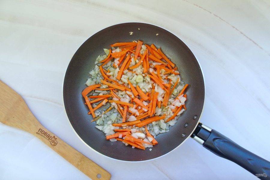 Морковь и лук нарежьте произвольно и выложите в сковороду с растительным маслом. Пассеруйте овощи до прозрачности лука.