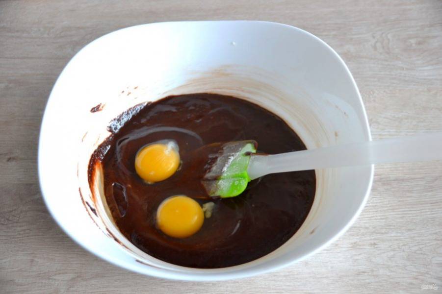 Всыпьте в шоколадную смесь муку, размешайте до однородности.