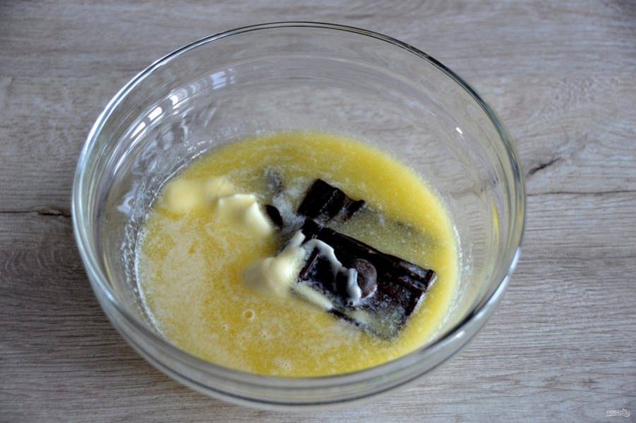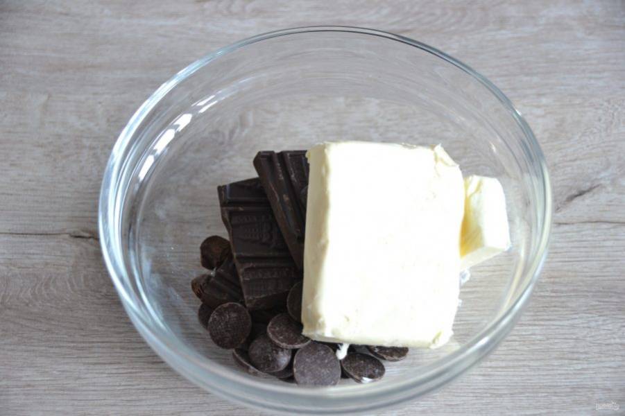 Выложите в миску шоколад и сливочное масло, растопите в микроволновой печи или на водяной бане.