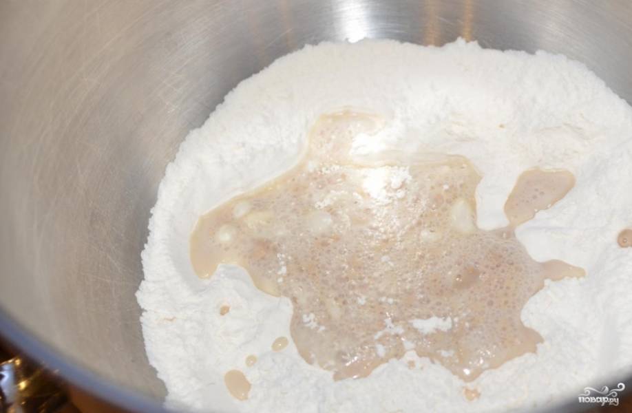Загрузить в тестомесилку муку, влить подошедшие дрожжи.