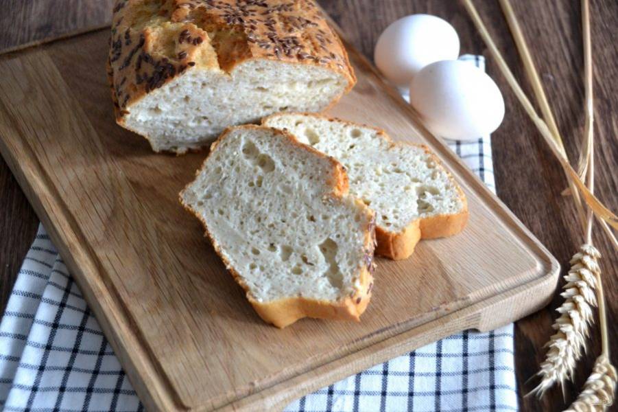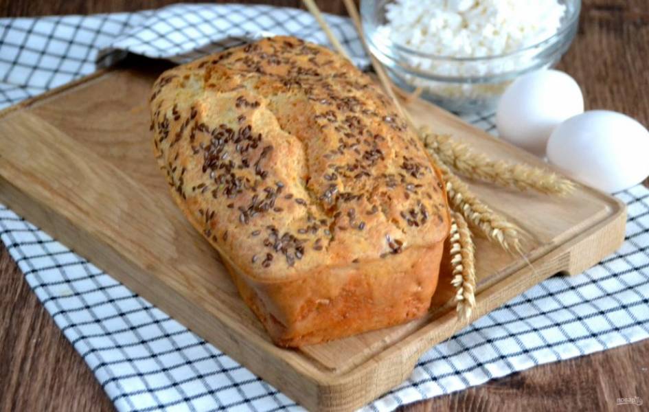 Белково-пшеничный хлеб с повышенным содержанием белка, в котором используется пшеничная мука с содержанием белка не менее 12,5-13%, яйца, творог, молоко. Данный рецепт бездрожжевой.