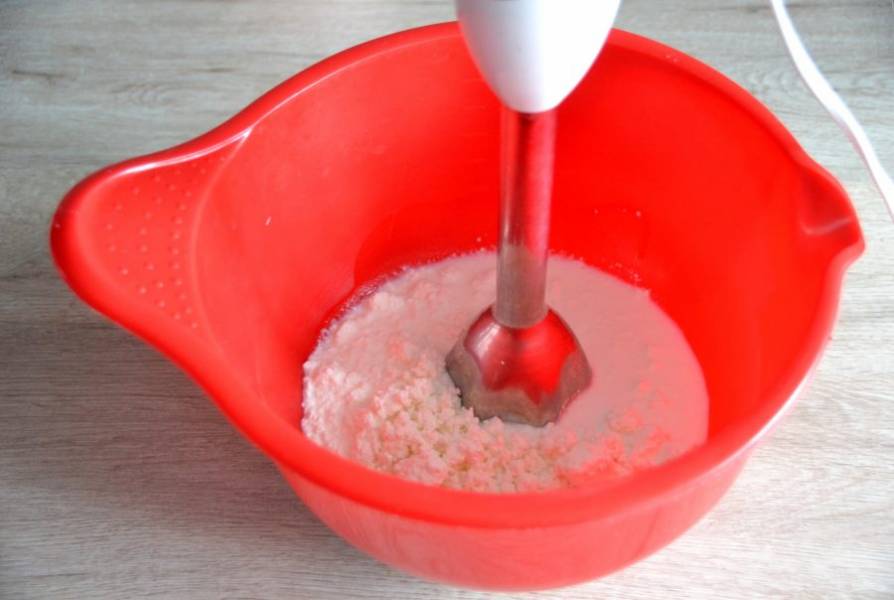 Залейте творог молоком. Пробейте блендером в однородную массу.