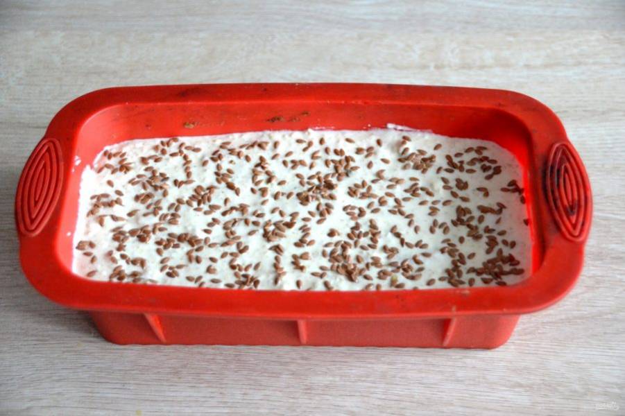 Выложите тесто в форму, сверху посыпьте семенами льна. Разогрейте духовку до 180 градусов.