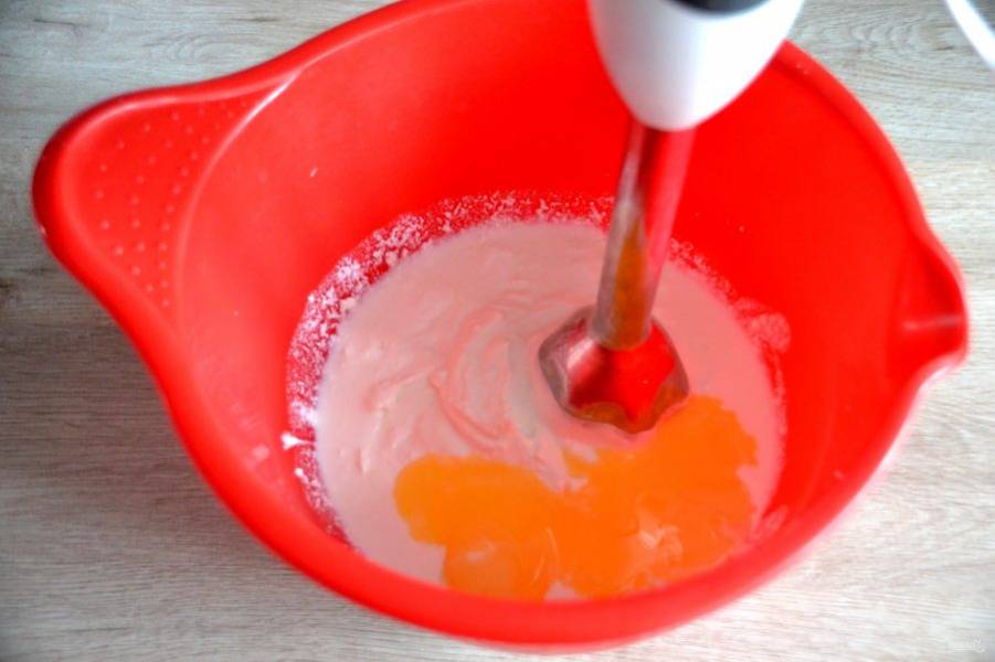 Отделите белки и желтки двух яиц, добавьте в молочно-творожную массу 2 желтка, смешайте. Белки отставьте на время в сторону.