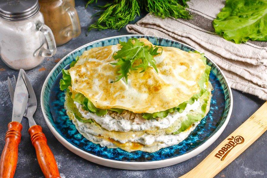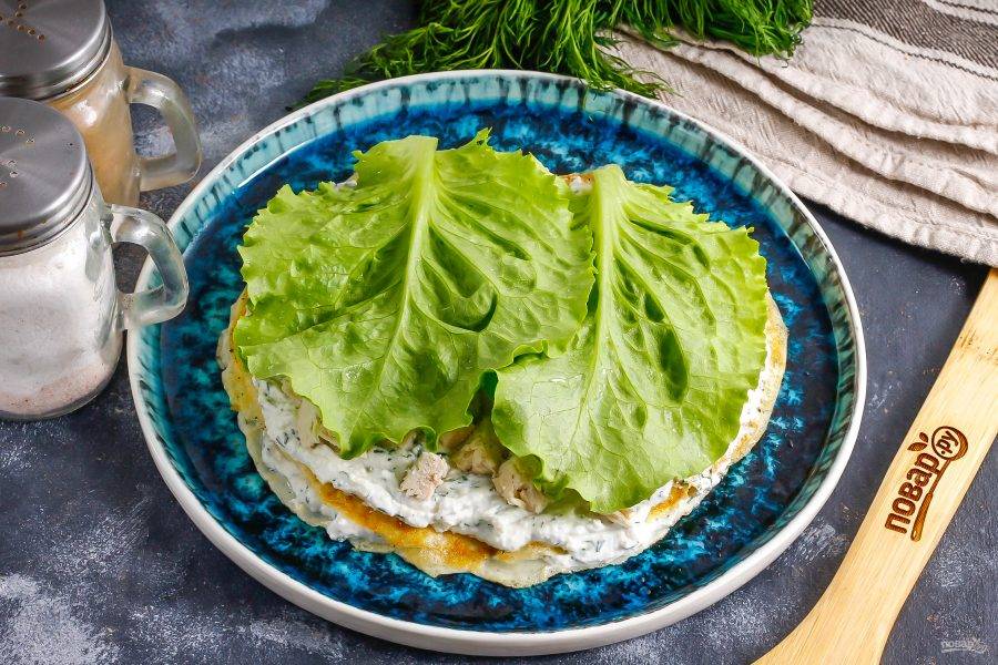 Промойте листья салата и обсушите бумажными салфетками. Срежьте стебли и выложите на куриное филе. Следом выложите снова белковый блин, творожную массу и нарезку филе. Повторяйте, пока продукты не закончатся. Последний слой — блинчик.