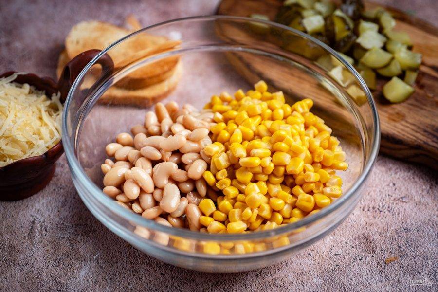 В просторную миску выложите консервированную фасоль и консервированную кукурузу.