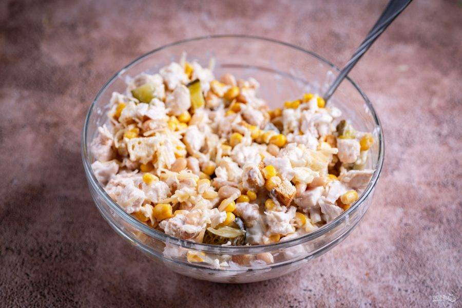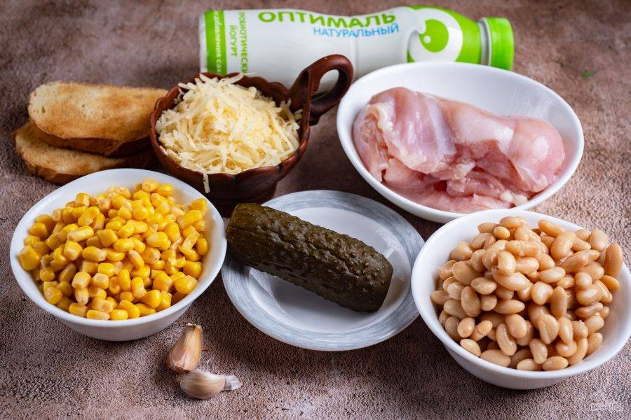 Слейте с баночки с фасолью и с баночки с кукурузой жидкость. В прохладной воде промойте куриную грудку. Чеснок почистите. Для сухариков подсушите ломтики белого хлеба в тостере или на сухой сковороде.