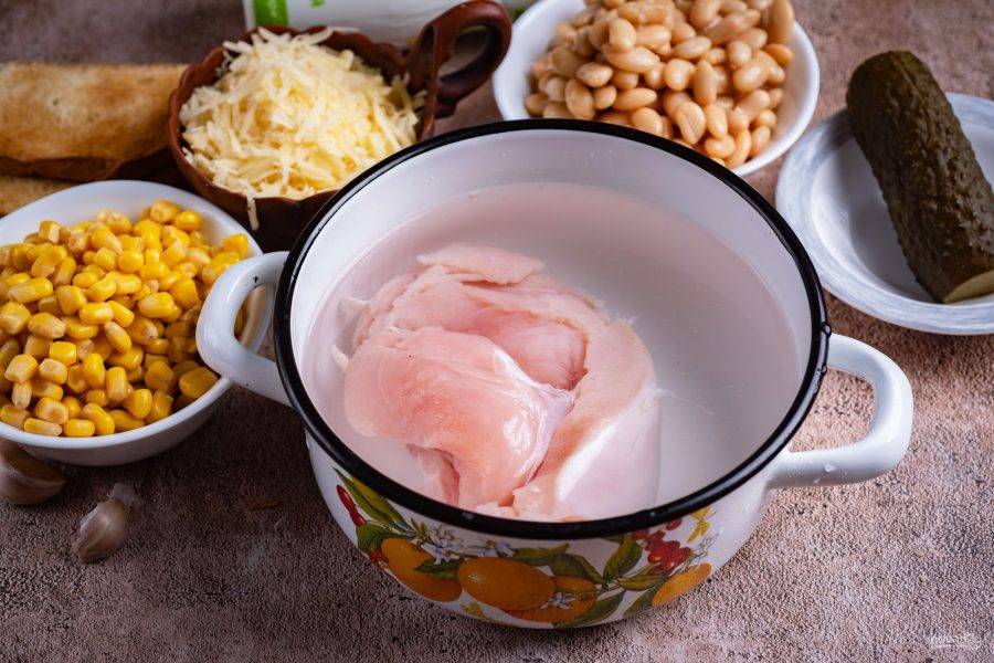 В кастрюле с водой отварите куриную грудку до готовности.