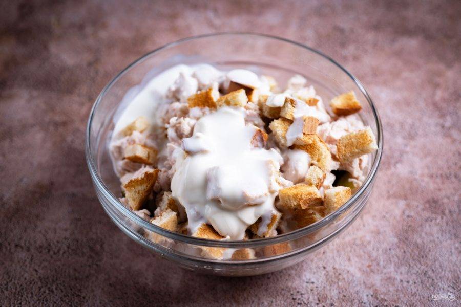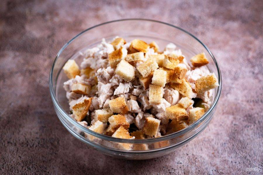 Нарежьте ломтики подсушенного белого хлеба небольшими кубиками и добавьте к салату.