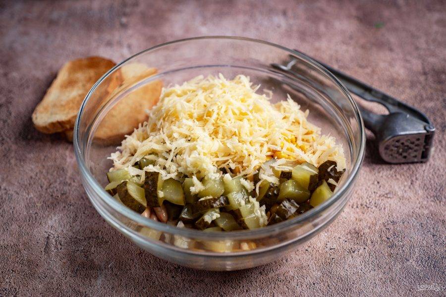 Добавьте к ним кубики огурцов и сыр, натертый на крупную терку, выдавите через чеснокодавилку зубчики чеснока.