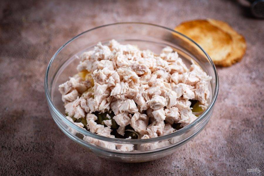 Отварную куриную грудку нарежьте небольшими кубиками.
