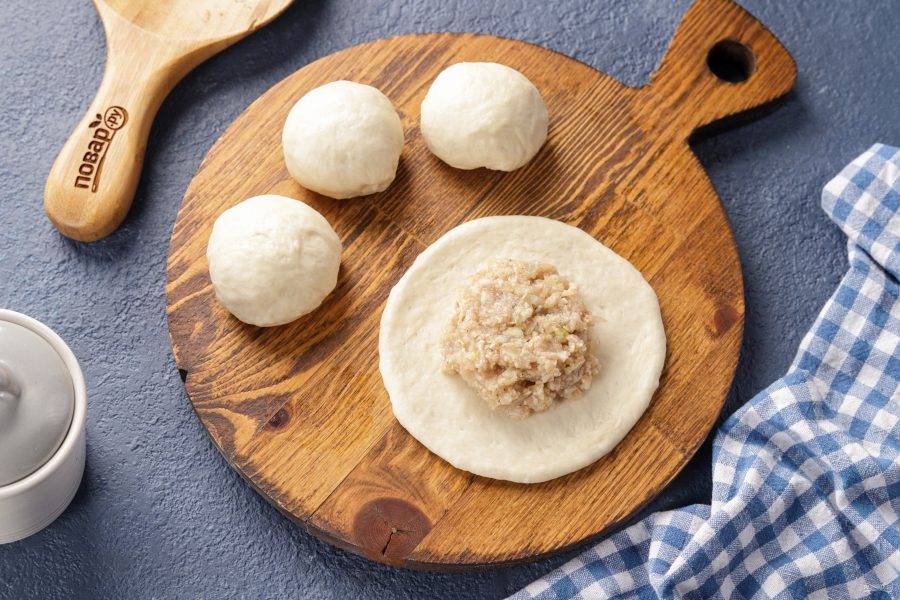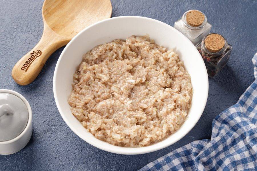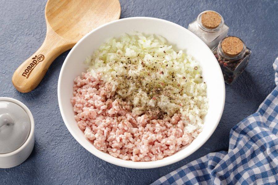 Тем временем приготовьте начинку. Если вы купили мясо, то пропустите его через мясорубку вместе с очищенным луком. Если же вы используете готовый фарш, то лук измельчите в блендере или нарежьте мелкими кубиками. Посолите и поперчите начинку по вкусу. Можно добавить любимые специи.