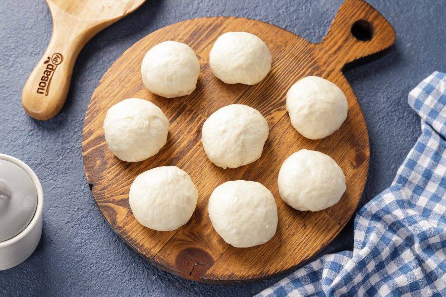 Поделите тесто на одинаковые куски. Я разделила на 8 частей, весом по 45 грамм. Если хотите беляши покрупнее, то делите на 4-6 частей. Каждую часть сформируйте в шарик.