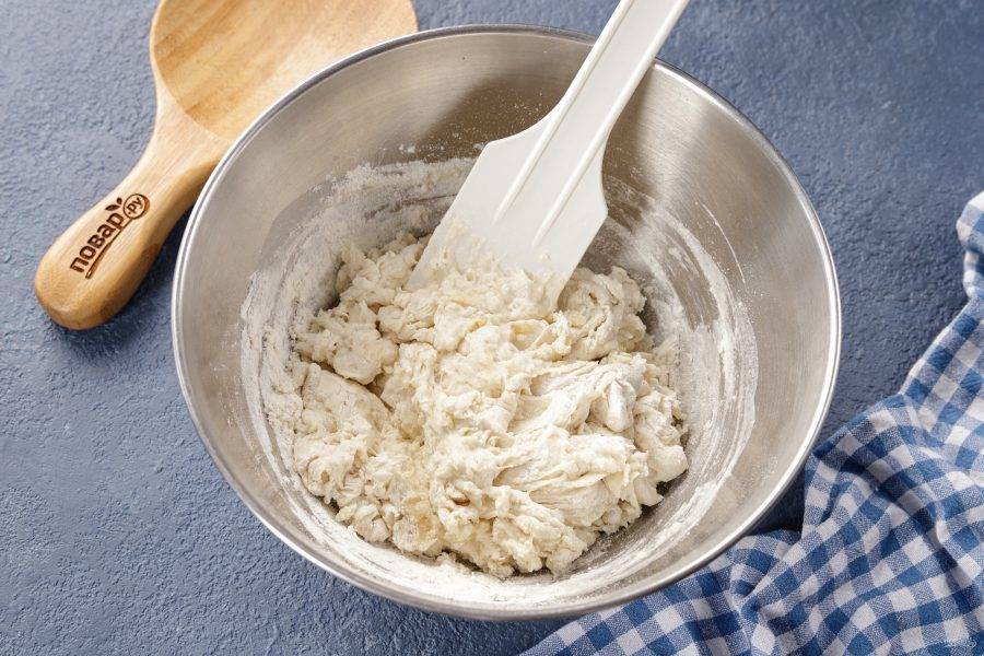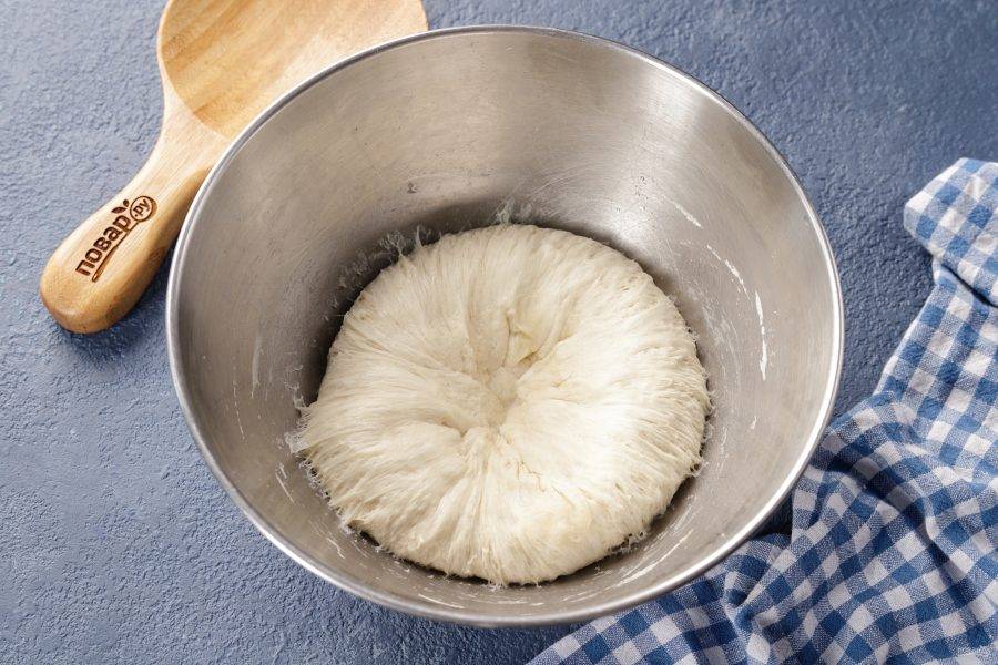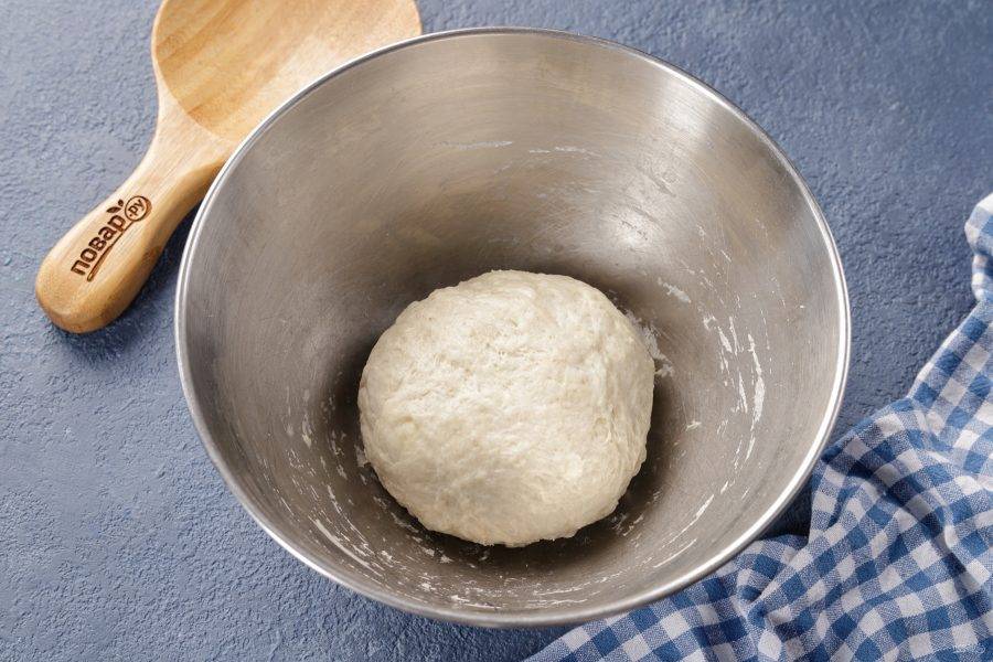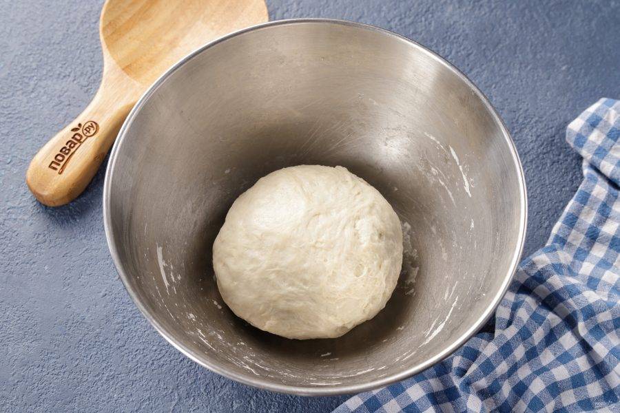 Тесто должно быть мягкое и немного липкое. Соберите его в шар, смажьте растительным маслом, накройте миску полотенцем и оставьте в тёплом месте на 20 минут.