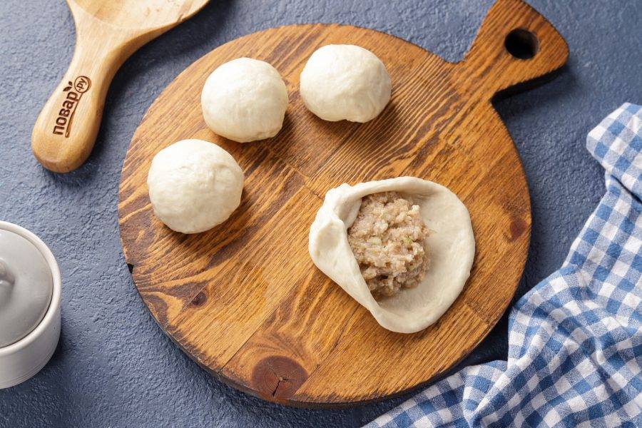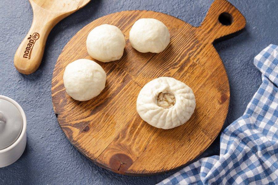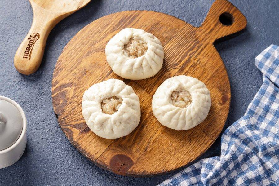 Подтяните края теста и собирая его в складки, защипните так, чтобы посередине осталось небольшое отверстие, благодаря которому начинка хорошо прожарится.