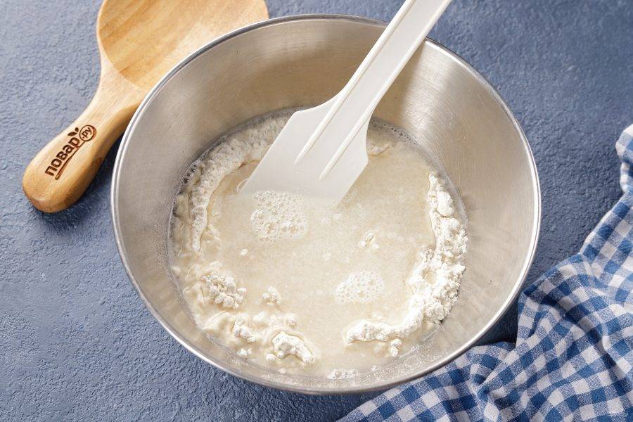 Перемешайте и влейте тёплую воду.