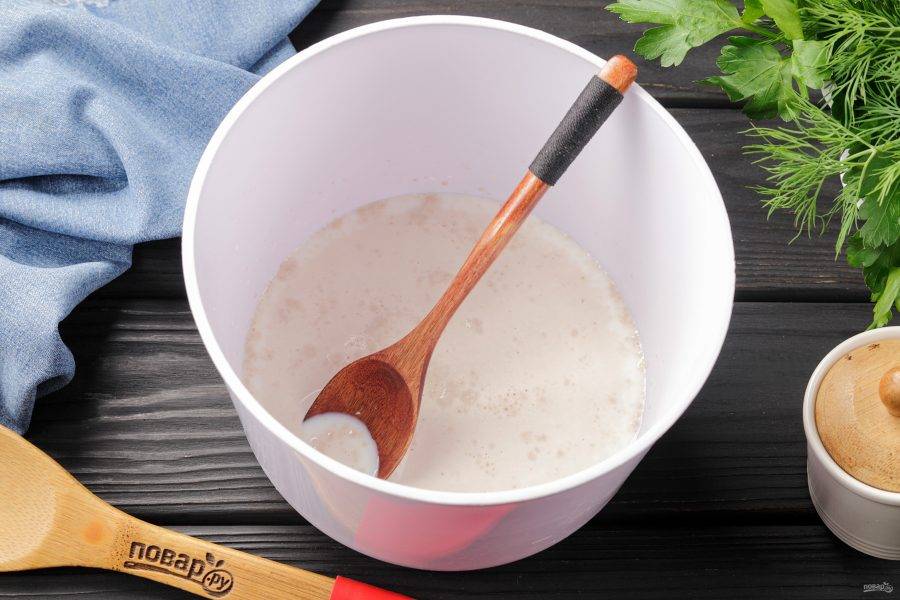 Соедините тёплое молоко, сахар и дрожжи. Перемешайте и дайте постоять 10 минут.