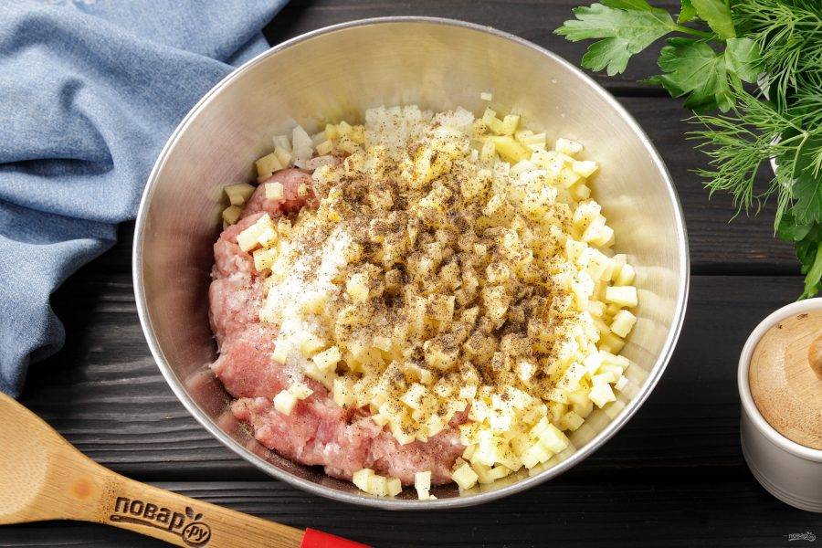 Пока поднимается тесто, приготовьте начинку. В фарш добавьте нарезанный мелкими кубиками лук и картофель. Добавьте соль и специи по вкусу.