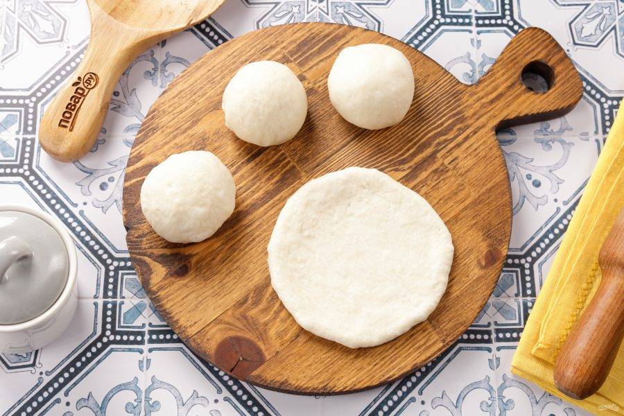 Готовое тесто обомните руками и разделите на 8 частей. Я готовлю небольшие беляши, если любите крупные, то делите на 4 или 6 кусочков. Сформируйте шарики.
