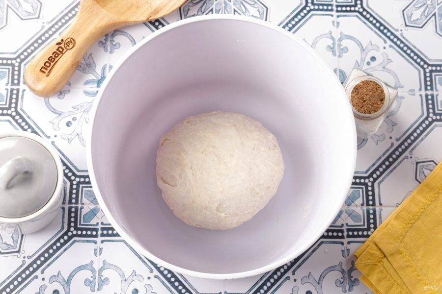 Соберите тесто в шар, накройте миску полотенцем и оставьте в тёплом месте на 20 минут.