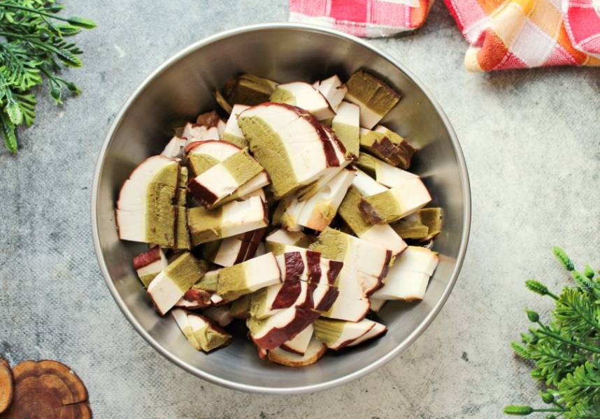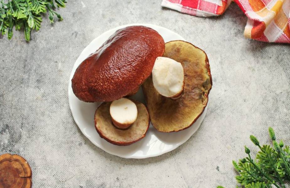 Свежие белые грибы переберите, удалите загрязнения и сполосните или оботрите влажной салфеткой. Замороженные грибы просто достаньте из морозильной камеры.