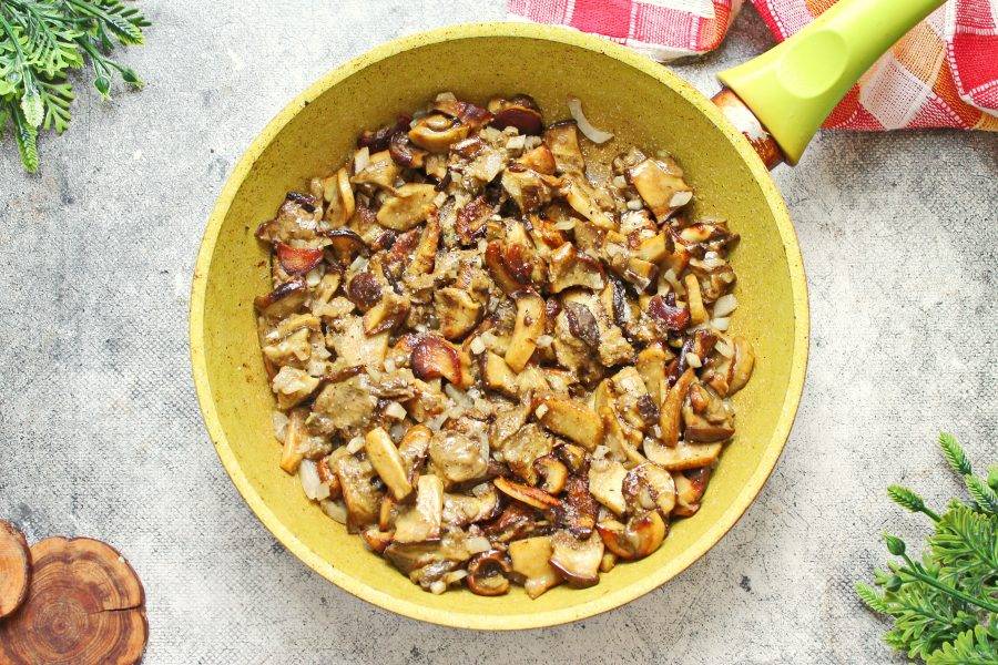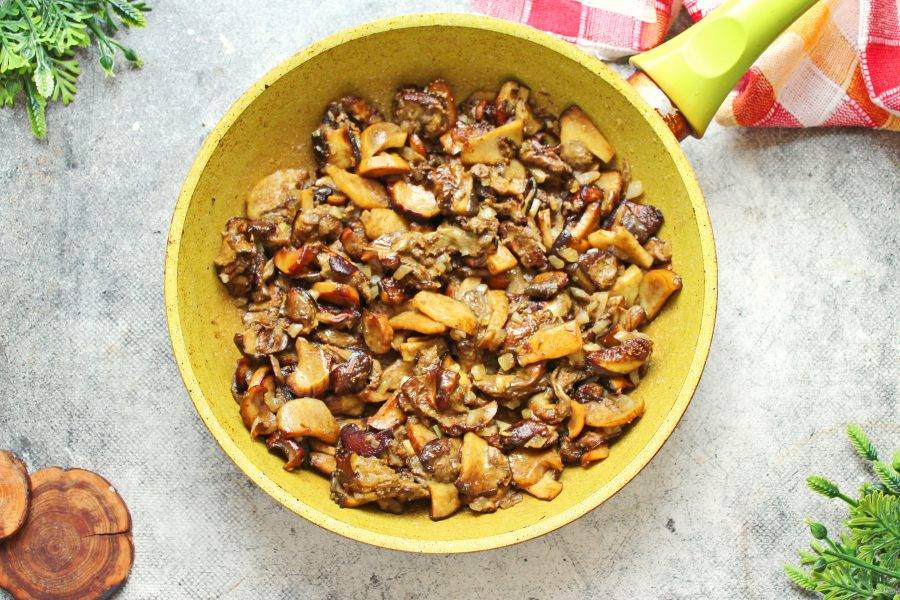 Обжаривайте белые грибы с репчатым луком на среднем огне в течение 4-5 минут, перемешивая.