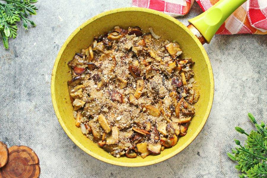 Посыпьте грибы панировочными сухарями. Перемешайте и обжаривайте все еще 1-2 минуты.