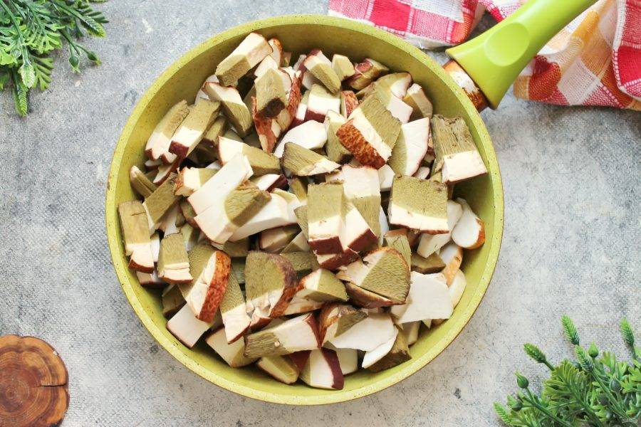 Белые грибы порежьте средними кусочками, а мелкие на 2-4 части.