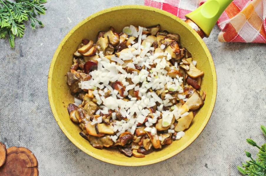 Репчатый лук мелко порежьте и добавьте в сковороду к обжаренным грибам.