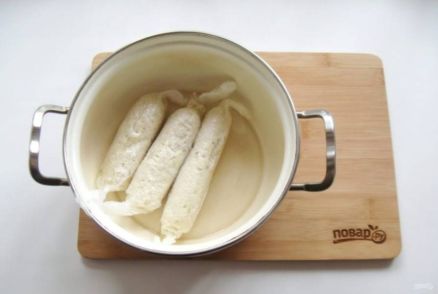После выложите колбаски в глубокую сковороду или кастрюлю с толстым дном. Залейте кипящей водой, добавьте соль и лавровый лист. Варите 20 минут.