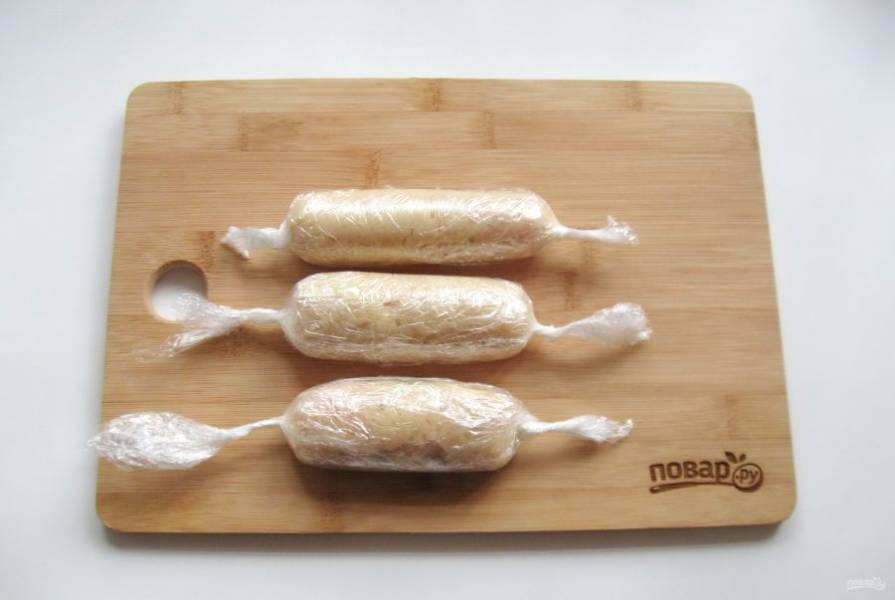 Выложите фарш в пищевую пленку и сформируйте колбаски. Отправьте в холодильник на срок от 2 до 12 часов.