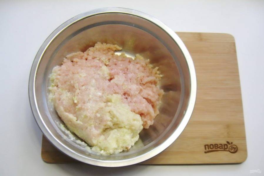 Мякоть свинины и куриное филе помойте. Пропустите через мясорубку дважды с жареным луком.