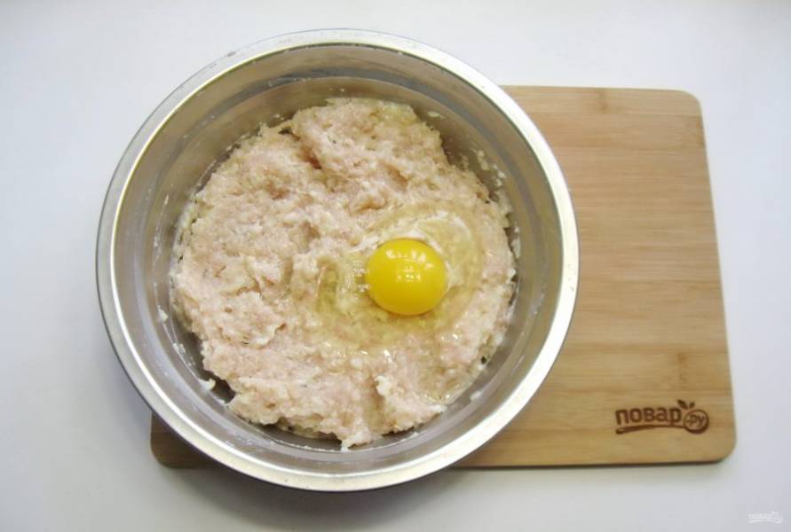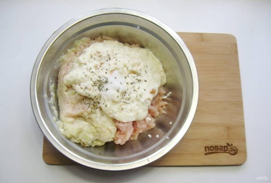 После крошки с молоком охладите и добавьте в фарш. Добавьте соль и специи.