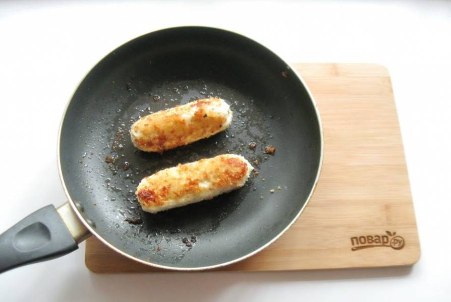 Вареные колбаски достаньте из кастрюли, охладите и снимите пленку. Обваляйте в хлебных крошках и обжарьте в сливочном масле на сковороде.