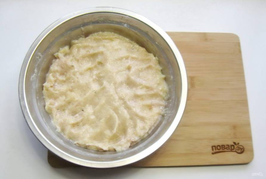 Постепенно, по две столовые ложки, влейте сливки и снова тщательно перемешайте. Я фарш в конце взбила блендером. Он стал более однородным и нежным.