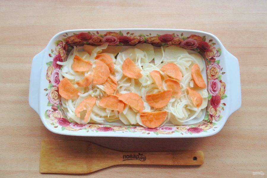 Картофель и репчатый лук очистите, помойте. Лук нарежьте полукольцами, а картофель пластинками. Форму смажьте подсолнечным маслом и выложите овощи.