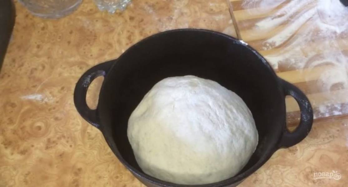 Оставьте при комнатной температуре на 3 часа. Выложите тесто на присыпанный мукой стол и округлите. Выложите тесто в чугунную кастрюлю, смазанную маслом.