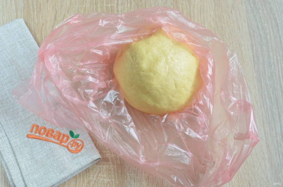 4. Замесите мягкое пластичное тесто, к рукам оно почти не липнет. Оберните пленкой или пакетом и уберите в холодильник на 30-40 минут.