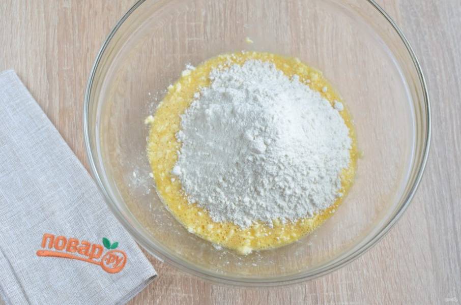 3. Муку просейте, соедините с разрыхлителем и введите в тесто.
