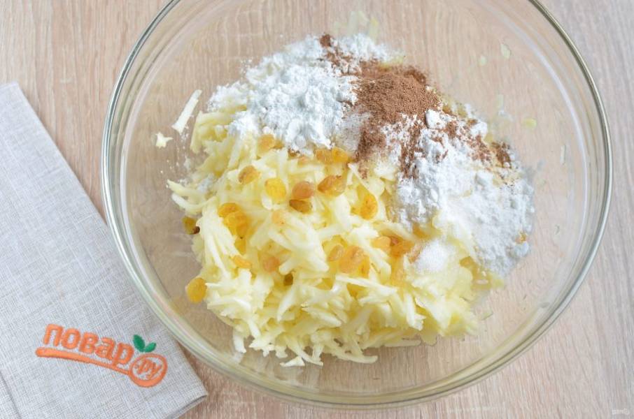 5. Для начинки очистите яблоки от кожуры и сердцевинок. Натрите их на крупной терке, добавьте корицу, изюм, сахар, крахмал. Перемешайте хорошо.