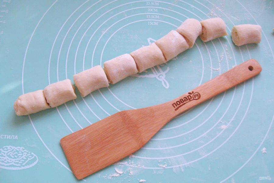 Нарежьте рулеты кусочкам шириной 3-4 сантиметра.
